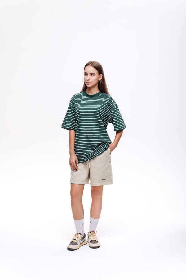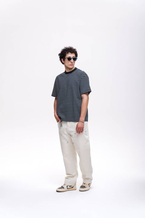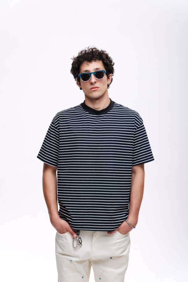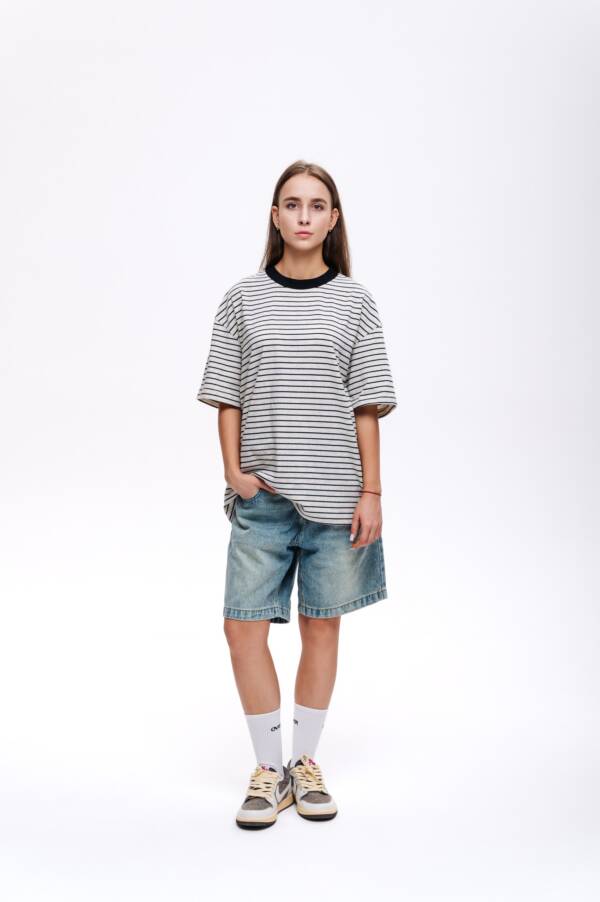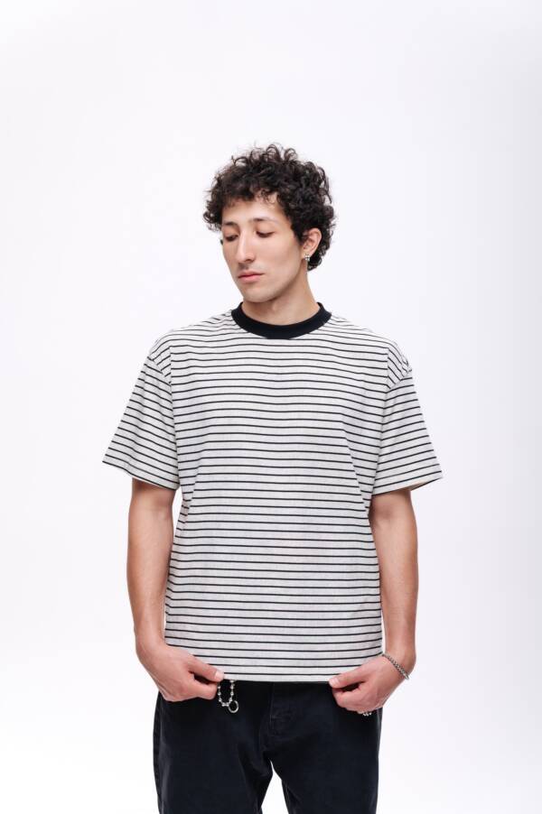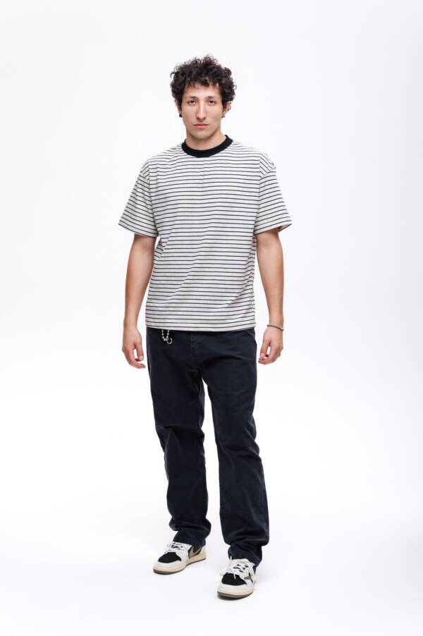 Lineup — ритм улицы в каждой полосе. Футболка свободного кроя из мягкой хлопковой ткани. Горизонтальные полосы создают динамику, но не перегружают. Вписывается в любой летний аутфит.
