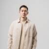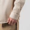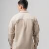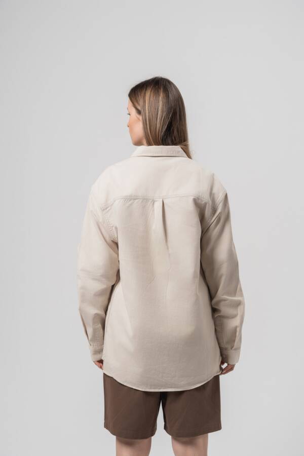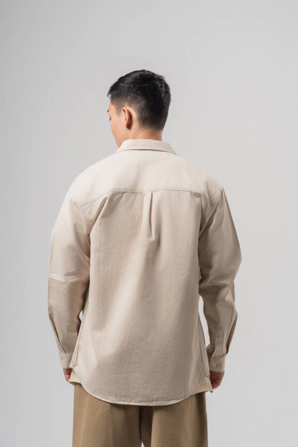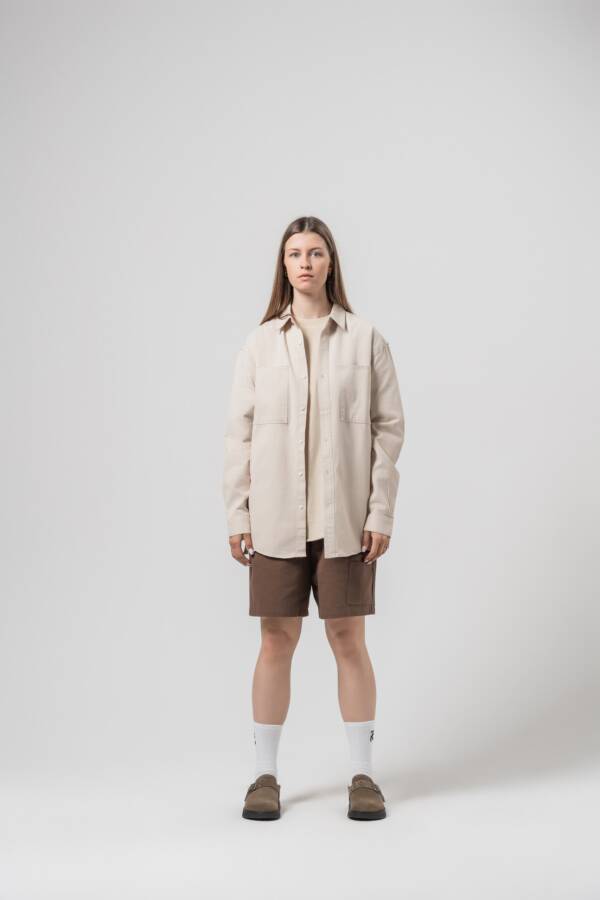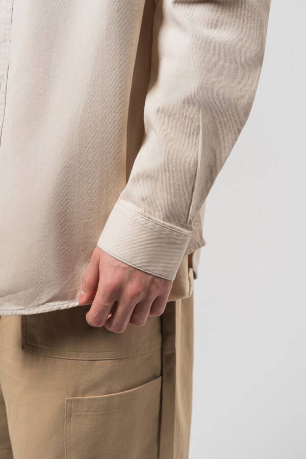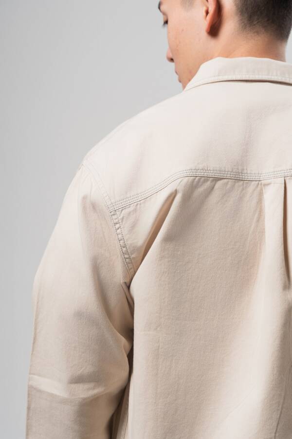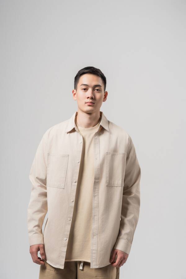 Куртка — рубашка из плотного хлопка в бежевом цвете.